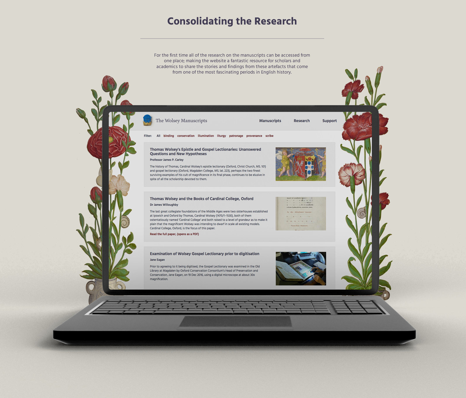 An innovative website design project to make a pair of ancient manuscripts openly accessible; and to be viewed side by side online for the very first time. The site is live and available at www.wolseymanuscripts.ac.uk